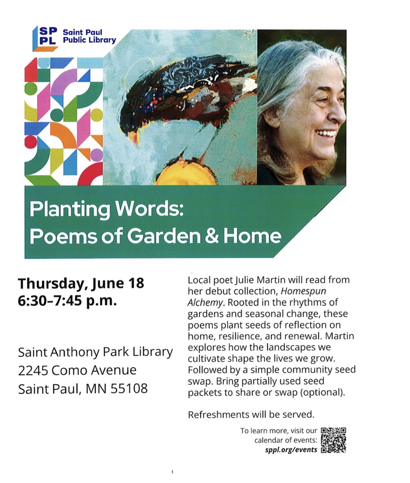 Book Launch: Julie Martin will read from her debut poetry book, Homespun Alchemy, followed by an open mic.